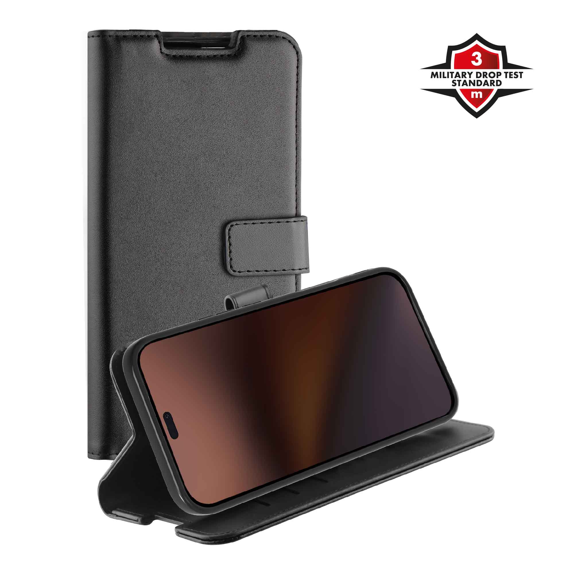 This protective case has three credit card slots and a stand function for optimal use in landscape mode. It protects your device against shocks, scratches and drops up to 3 meters in accordance with MIL-STD810H-516.8. The elegant PU leather material has a high-quality feel and look. The perfect fit ensures that all ports and connections are fully accessible.