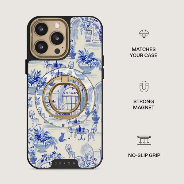 This magnetic mobile ring attaches with a satisfying click – no glue, no fuss. Hold it when you want to scroll with one hand, use it as a handy stand when you want to watch hands-free, or as a stylish accessory that perfectly matches your BURGA case.