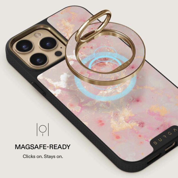 Note! This mobile ring only works with MagSafe-compatible iPhones (12 and later) and BURGA’s MagSafe cases. It does not work with cases without MagSafe or with wireless charging.