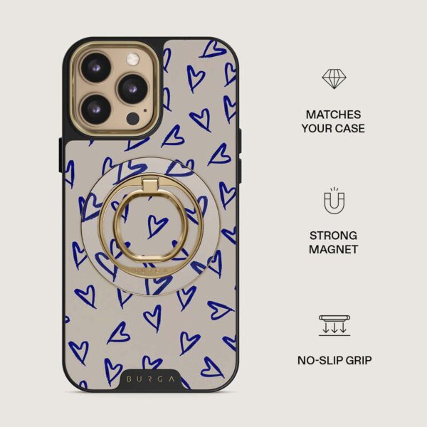 This magnetic mobile ring attaches with a satisfying click – no glue, no fuss. Hold it when you want to scroll with one hand, use it as a handy stand when you want to watch hands-free, or as a stylish accessory that perfectly matches your BURGA case.