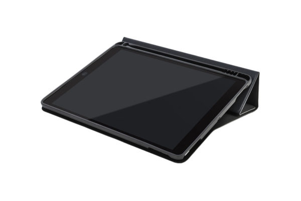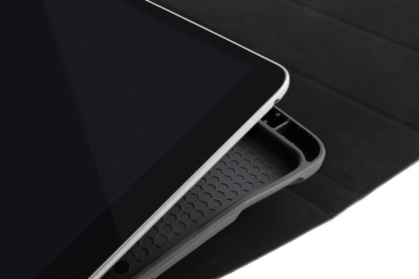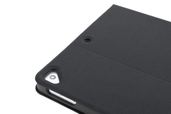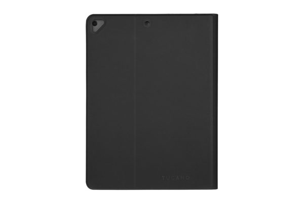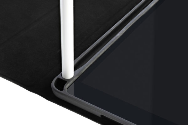 Case for iPad 10.2″ with semi-rigid back shell and scratch-resistant interior, convertible into a comfortable standup for different positions of use. Camera hole on the back and Apple Pencil holder on the inside.