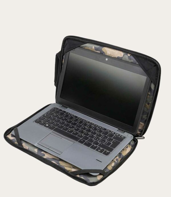 Protective sleeve for laptop 14″ and MacBook Pro 14″ made with fabric produced from recycled plastic . The zip goes around three sides, allowing you to open the sleeve completely. You can also use it as a work surface, anchoring the corners of your device with two elastic bands. The convenient external pocket for accessories and the side handle make the product very functional.