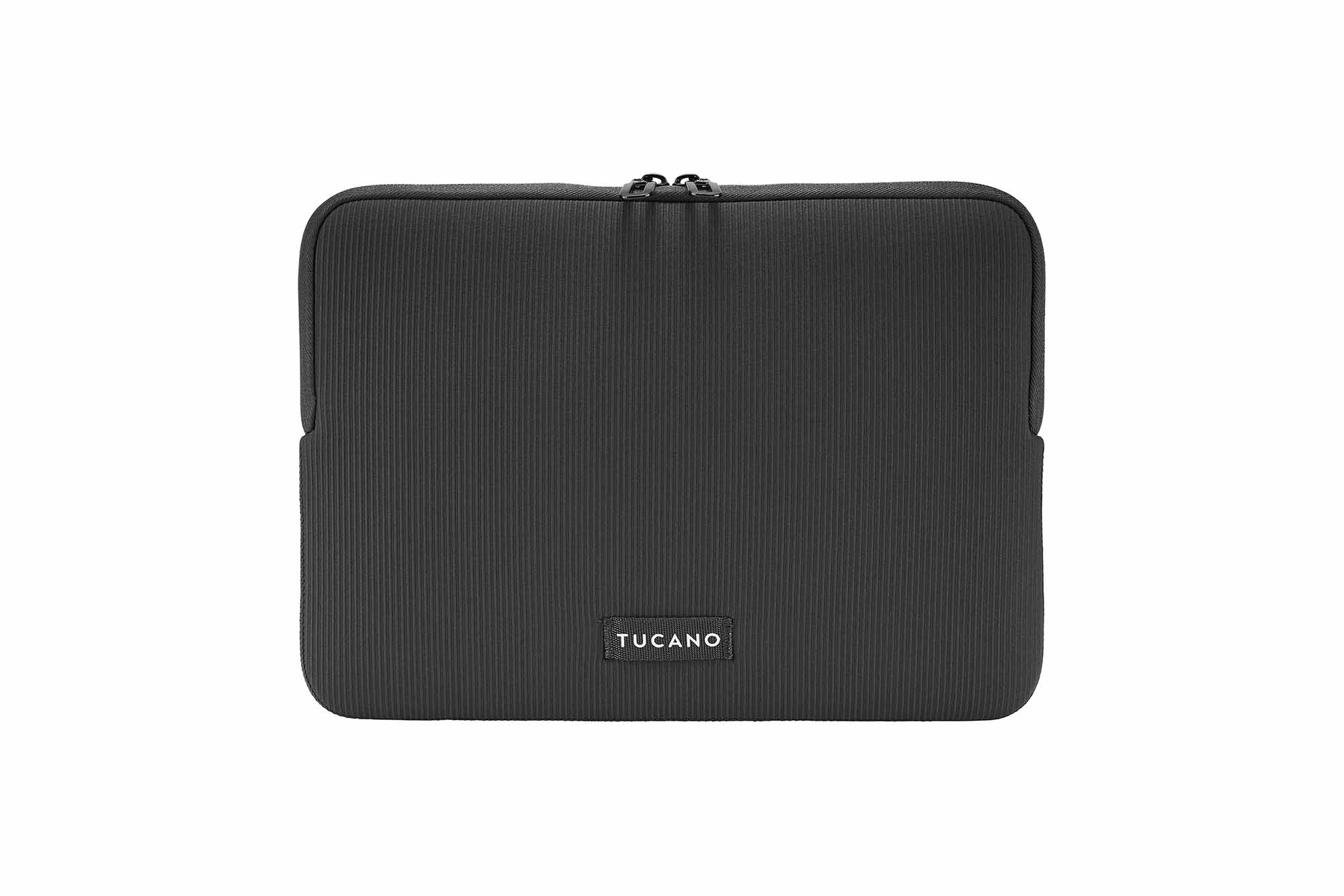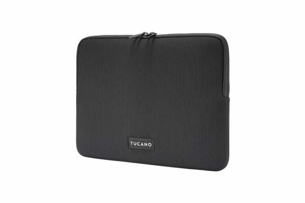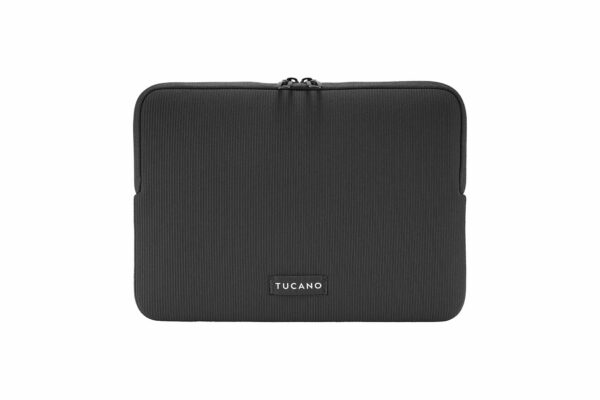 Neoprene sleeve with striped pattern, designed for laptops and MacBooks. The 4 mm thick structure guarantees excellent protection while maintaining an ultra-thin profile thanks to the flatlock seams. Equipped with Anti-Slip System®, an elastic insert that prevents scratches and slipping. The inner protective edge provides extra protection, while the double-pull zip makes it easy to open. The logo, printed on a centre-sewn label, adds a distinctive design and personality. Made partly from recycled plastic.