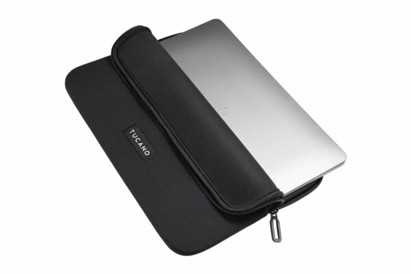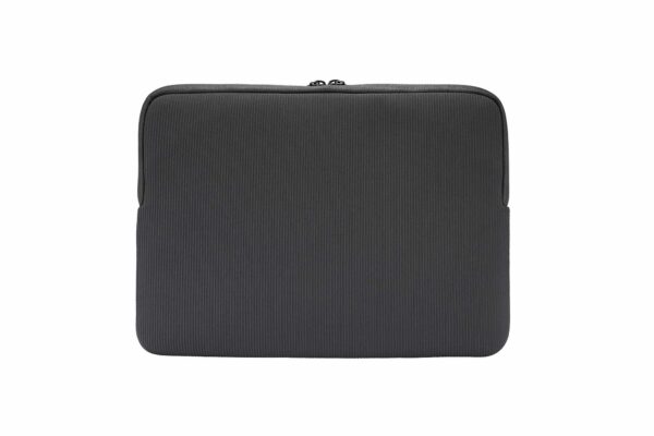 Neoprene sleeve with striped pattern, designed for laptops and MacBooks. The 4 mm thick structure guarantees excellent protection while maintaining an ultra-thin profile thanks to the flatlock seams. Equipped with Anti-Slip System®, an elastic insert that prevents scratches and slipping. The inner protective edge provides extra protection, while the double-pull zip makes it easy to open. The logo, printed on a centre-sewn label, adds a distinctive design and personality. Made partly from recycled plastic.