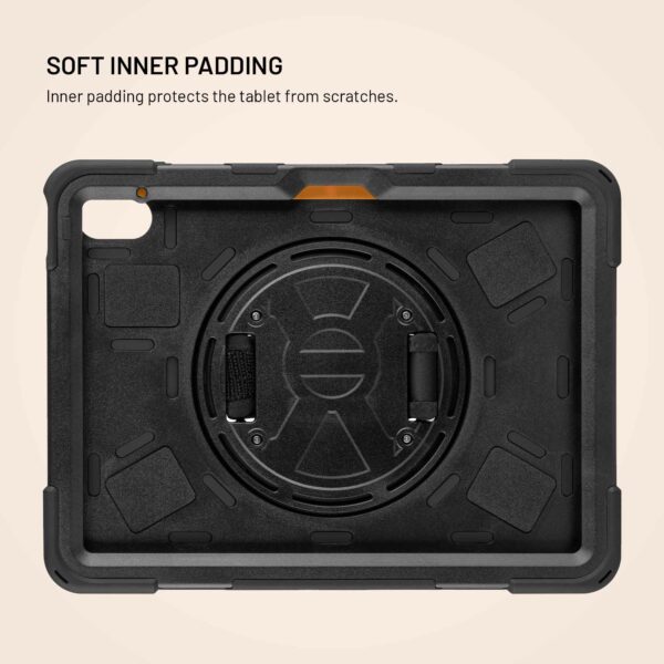 On the back of the case is a rotating handle that makes it easy to hold and handle your tablet. The handle can be rotated 360°, so you can easily adjust it to any position and use the Velcro strap to adjust the handle strap to any hand size. The handle also functions as a practical stand – just fold it out and the tablet is placed stably in a horizontal position, perfect for watching videos, video calls or working on the go.