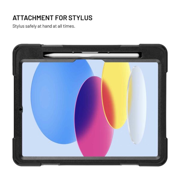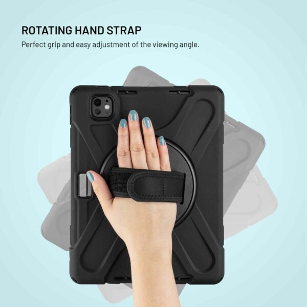 On the back of the case is a rotating handle that makes it easy to hold and handle your tablet. The handle can be rotated 360°, so you can easily adjust it to any position and use the Velcro strap to adjust the handle strap to any hand size. The handle also functions as a practical stand – just fold it out and the tablet is placed stably in a horizontal position, perfect for watching videos, video calls or working on the go.
