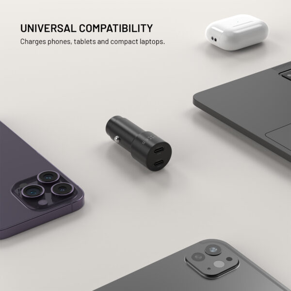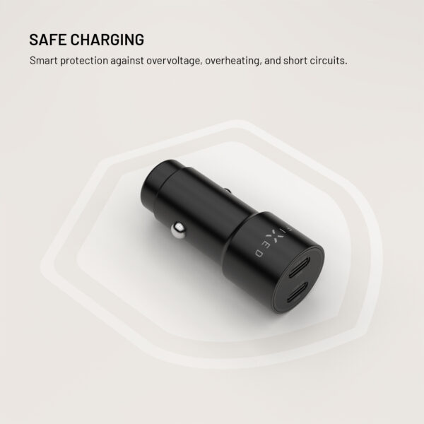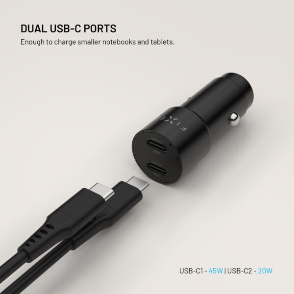 The FIXED car charger provides powerful and safe charging at up to 65 W for all your devices while driving. Thanks to two USB-C ports with outputs of 45 W and 20 W, it can charge a phone, tablet or even provide enough power to charge a laptop at the same time.