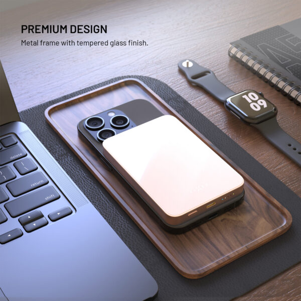 The 5,000 mAh capacity is enough for one to two phone charges, and four LEDs clearly show the battery status. The casing combines a metal frame and tempered glass with a matte finish on the charging side, protecting your phone from scratches. Thanks to its slim design of only 9.4 mm, it blends in with your phone and fits comfortably in your pocket.
