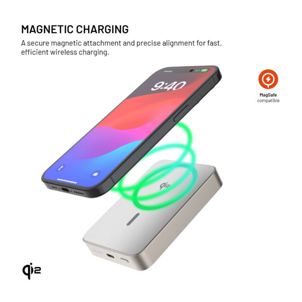 Thanks to the integrated MagSafe magnets, it can be attached to the back of iPhone 12 and newer models or phones equipped with a MagSafe case. When attached, charging starts automatically with a power output of up to 15 W. If your phone does not support MagSafe, you can use the power bank’s charging surface as a wireless charging pad.