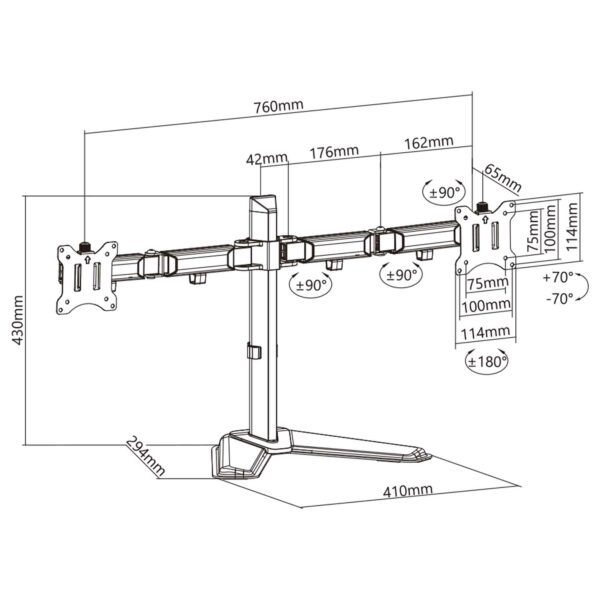 Enhance your setup with this desktop wall mount. With an arm reach of 380 mm, it is designed for monitors between 17 and 32 inches. Swivel and rotate easily with a flexibility of +90° to -90°. Made of steel and plastic, with an elegant grey finish. VESA-compatible, with removable plate and cable management.