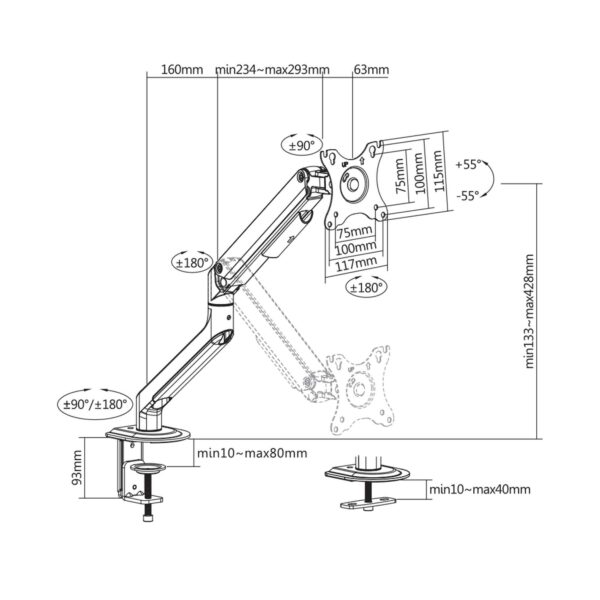 You can easily swivel, tilt and rotate the screen. The silver-coloured steel and aluminium construction provides elegant durability. It is also suitable for curved screens and can support up to 9 kg per screen. With removable VESA plate, cable management and adjustable clamp or grommet installation.