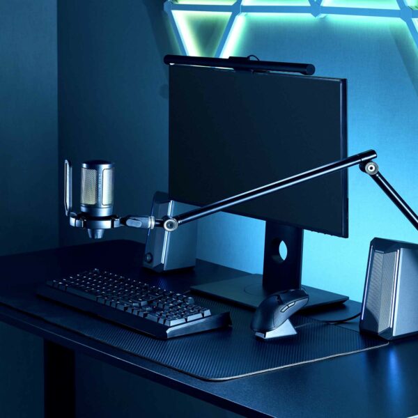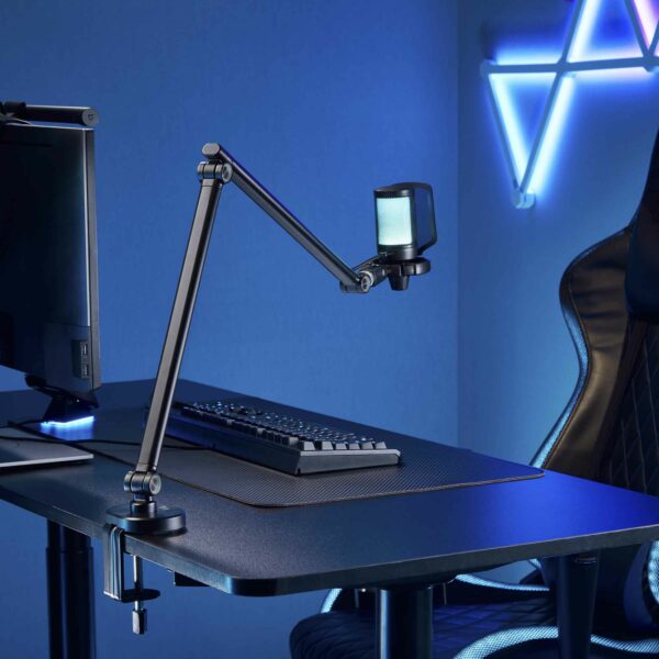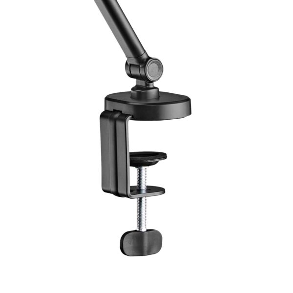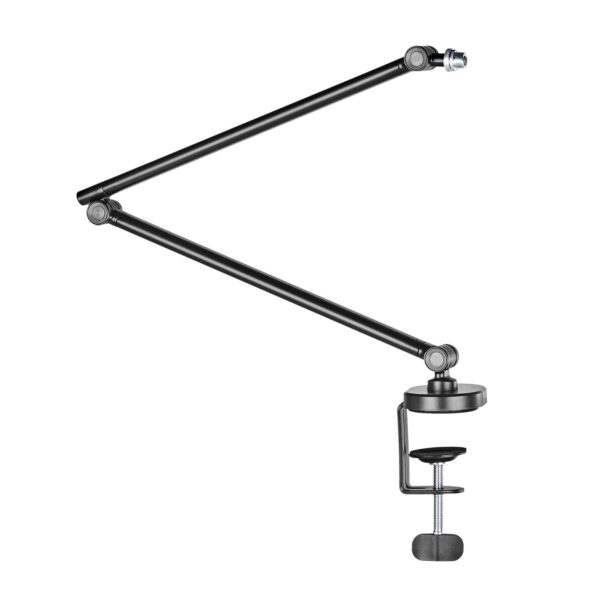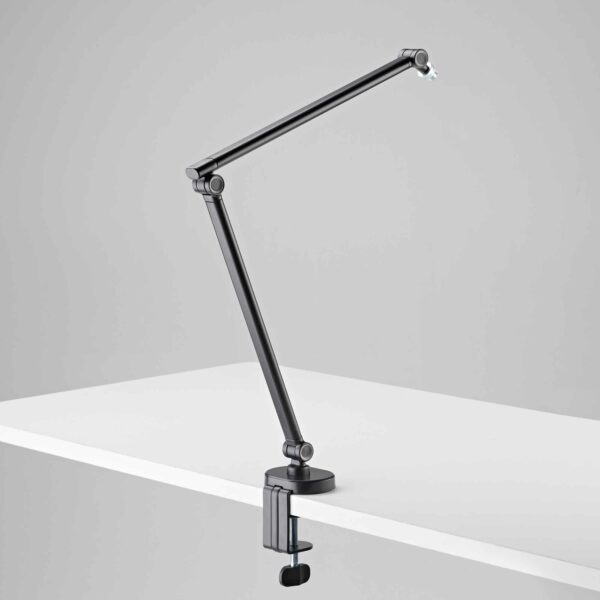 Made of steel, plastic and aluminium, it is an elegant powerhouse in black/grey with a powder coating. With adjustable height (0–812 mm) and various microphone mounts, it is your versatile audio companion. Easy clamp mounting and a maximum load of 1 kg make it a must-have for creators.