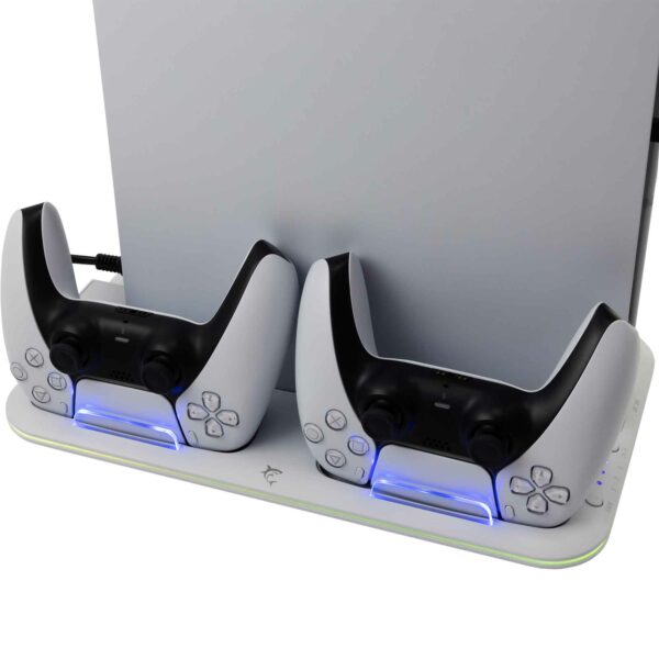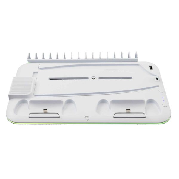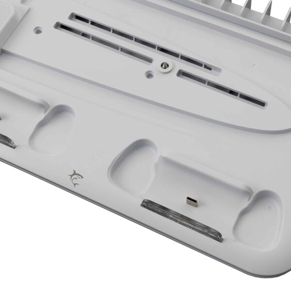 WHITE SHARK Kimura-2 is a multifunctional cooler, stand and charger designed for PS5. With fan speeds of up to 5000 RPM, it ensures optimal cooling. It has two charging compartments, a sleek white and grey design, and can hold up to 15 game discs. Compact and efficient, perfect for enhancing your gaming experience.