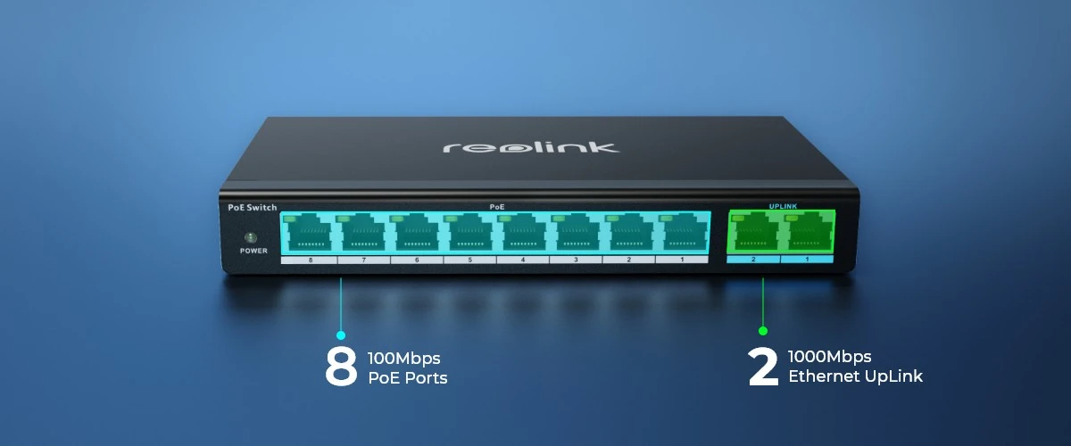 Reolink RLA-PS1 is a reliable PoE switch with 8 PoE+ ports (10/100 Mbps) and 2 Gigabit Ethernet uplink ports (10/100/1000 Mbps). It complies with the IEEE802.3af/at standard and can deliver up to 30 W to each PoE port and has a total power budget of 120 W for up to 8 PoE devices.